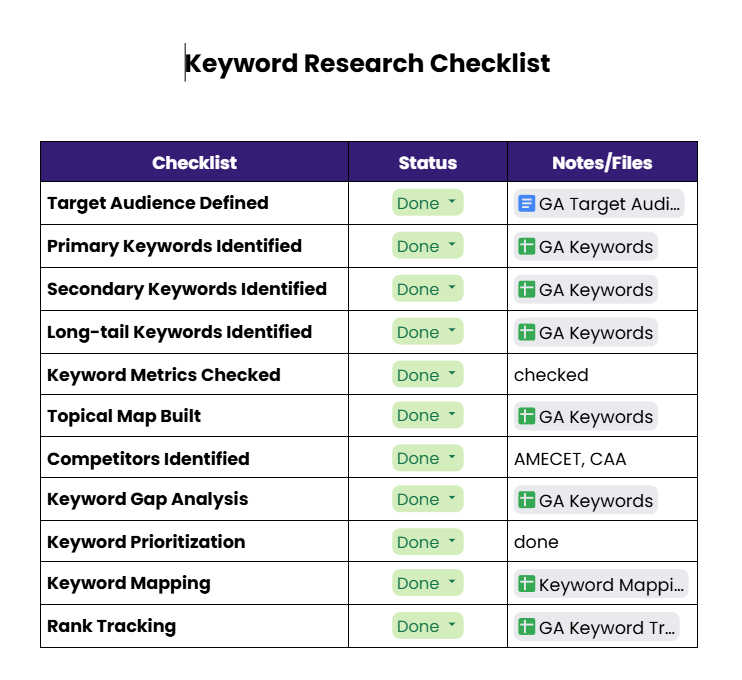Professional Checklists | – ✅ Total Audit Checklist – ✅ Keyword Research Checklist (Fully Documented) – ✅ 50-Point On-page SEO Checklist |